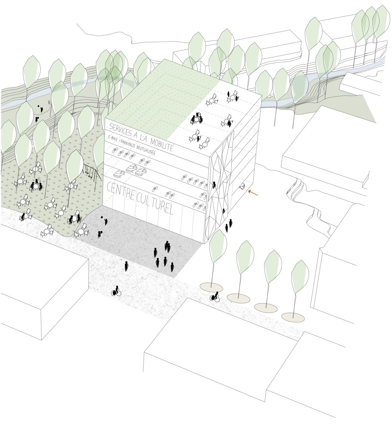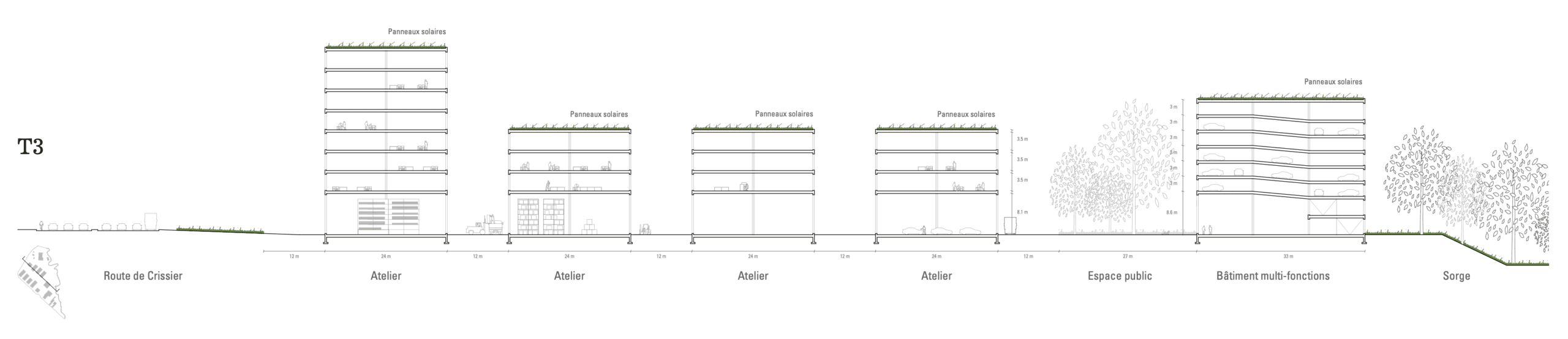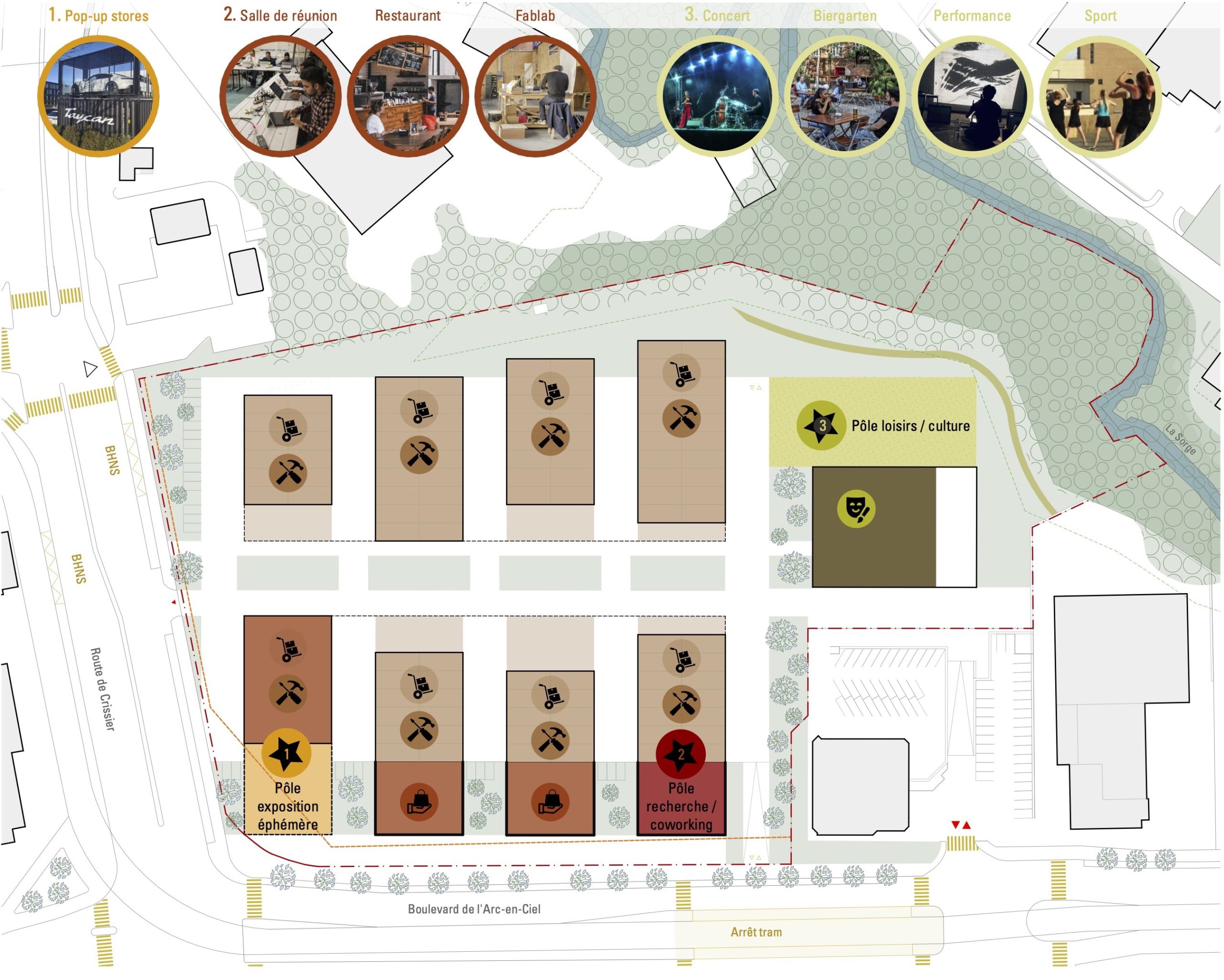 Le processus de reconversion de ce site industriel est tout aussi important que l’image urbanistique finale. C’est pourquoi les domaines de la construction durable et de la rénovation, semblent particulièrement pertinents au vu du très grand potentiel de réhabilitation et de rénovation du parc immobilier de suisse romande. L’économie circulaire sur le site, grâce au réemploi des matériaux ou l’autoproduction de ceux-ci donne l’occasion au futur pôle d’activités de se construire sur lui-même, tout en permettant à d’autres activités, telles que la logistique alimentaire, la réalisation d’équipements sportifs et de culture(s) alternative(s) de venir compléter l’offre programmatique. Ces programmes complémentaires à la zone industrielle viennent donner de l’attractivité au site en dehors des heures de bureaux, et sont le moteur événementiel du lieu.