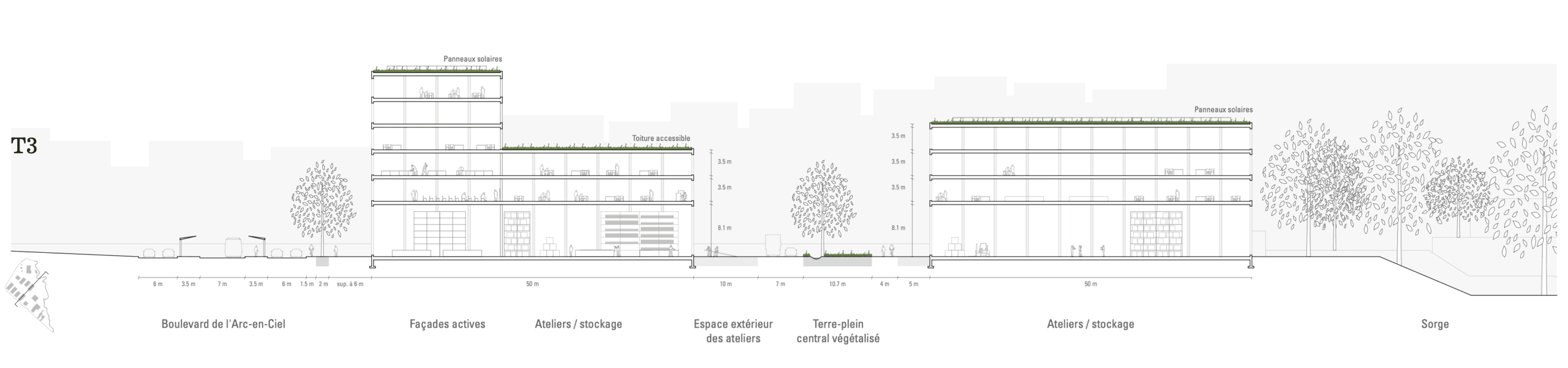 A moyen terme (T2), la grande halle Jallut ainsi que ses bâtiments attenants forment le support de la transformation du site tandis que les halles situées sur le boulevard de l’Arc-en-Ciel sont démontées afin de valoriser cet espace comme façades actives. Ces nouveaux bâtiments, idéalement situés à l’interface entre le tram et le cœur du site, accueillent les activités « clés » liées aux entreprises telles qu’un Fablab, une matériauthèque, un restaurant, une salle de conférences, une salle de réunion ou des espaces de coworking, etc. Lors de cette temporalité, un espace public accueillant une programmation culturelle comme des spectacles, concerts et évènements sportifs serait créé et ferait le lien entre l’arrêt du tram et le cordon boisé de la Sorge. Un « Biergarten » se situerait à une des extrémités de la place afin de pouvoir bénéficier d’une terrasse à proximité du cordon boisé de la Sorge.