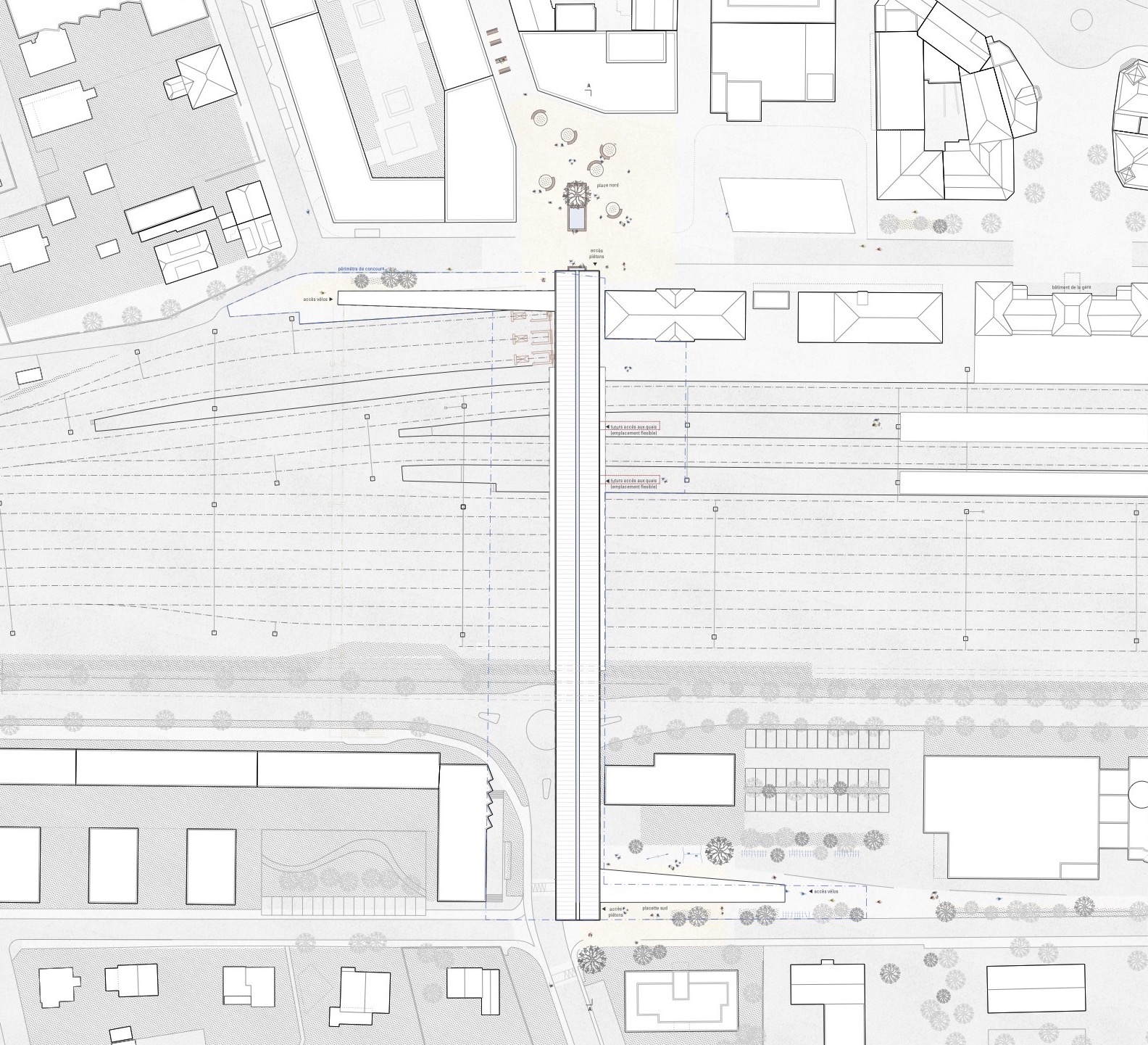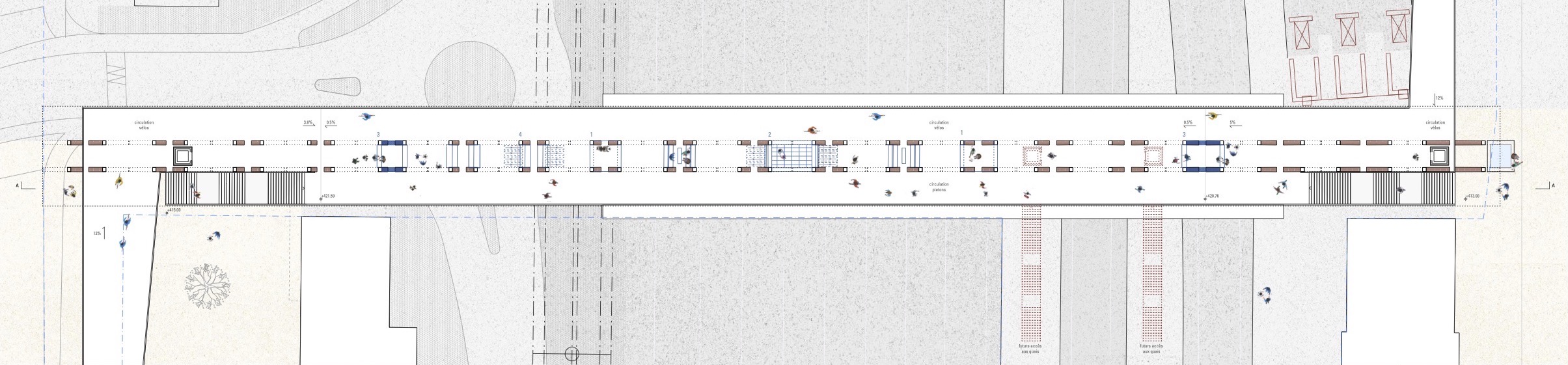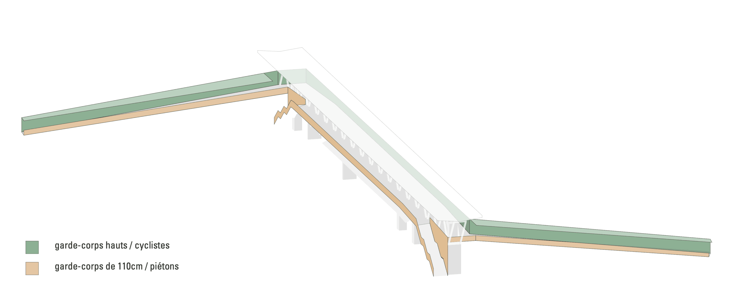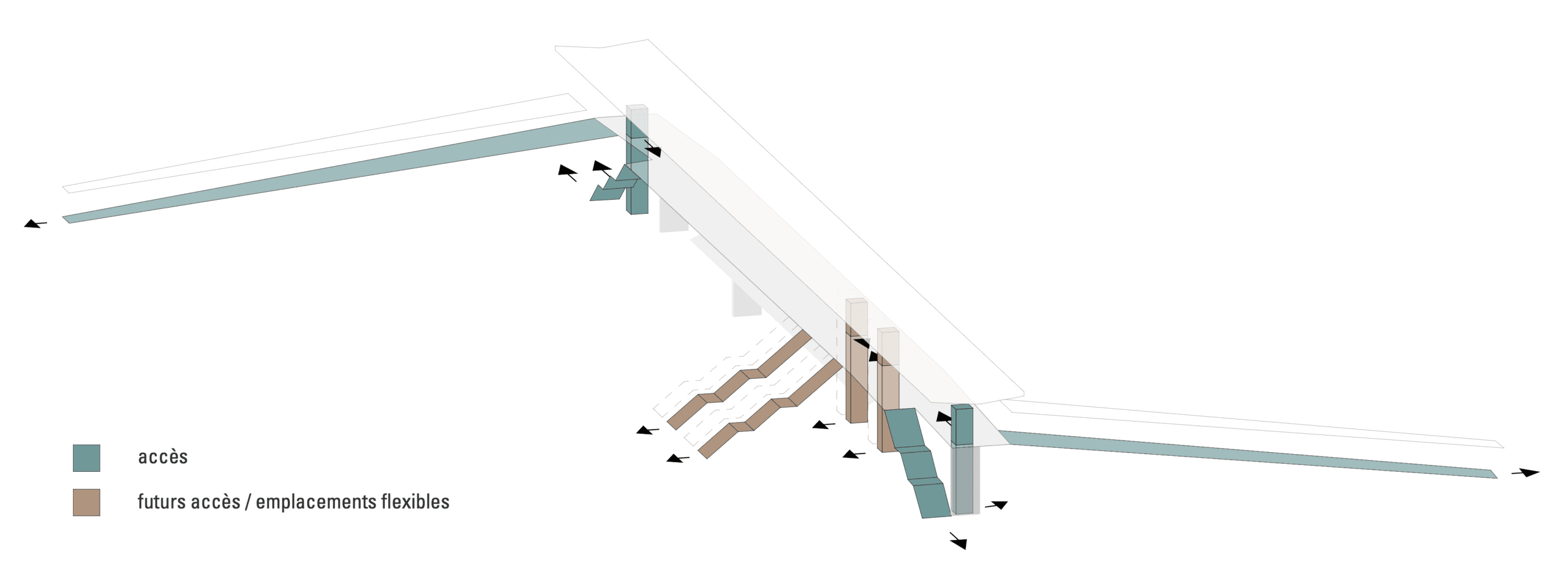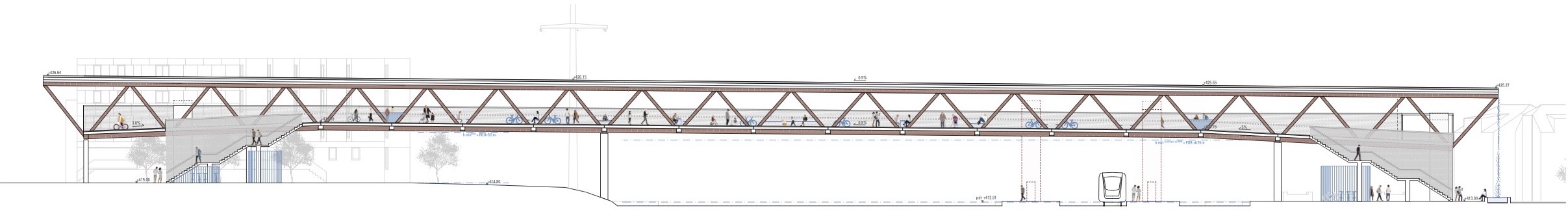 La passerelle est conçue comme un espace public qui franchit les voies CFF, conjugue les flux piétons et vélos, et abrite des fonctions de mobilité et de détente. En effet, l’espace inter-structurel qui sépare les flux offre un lieu apaisé aux utilisateurs intégrant les sorties d’ascenseurs actuels et futurs, des parkings vélos, et peut accueillir des équipements accessoires tels que kiosque/bar, espaces pour s’asseoir et se retrouver ou encore jeux d’enfants. L’ensemble de ces programmes sont au cœur de la double structure triangulée qui assure le franchissement des voies, supporte la couverture, et offre une totale flexibilité d’exploitation à l’avenir.
