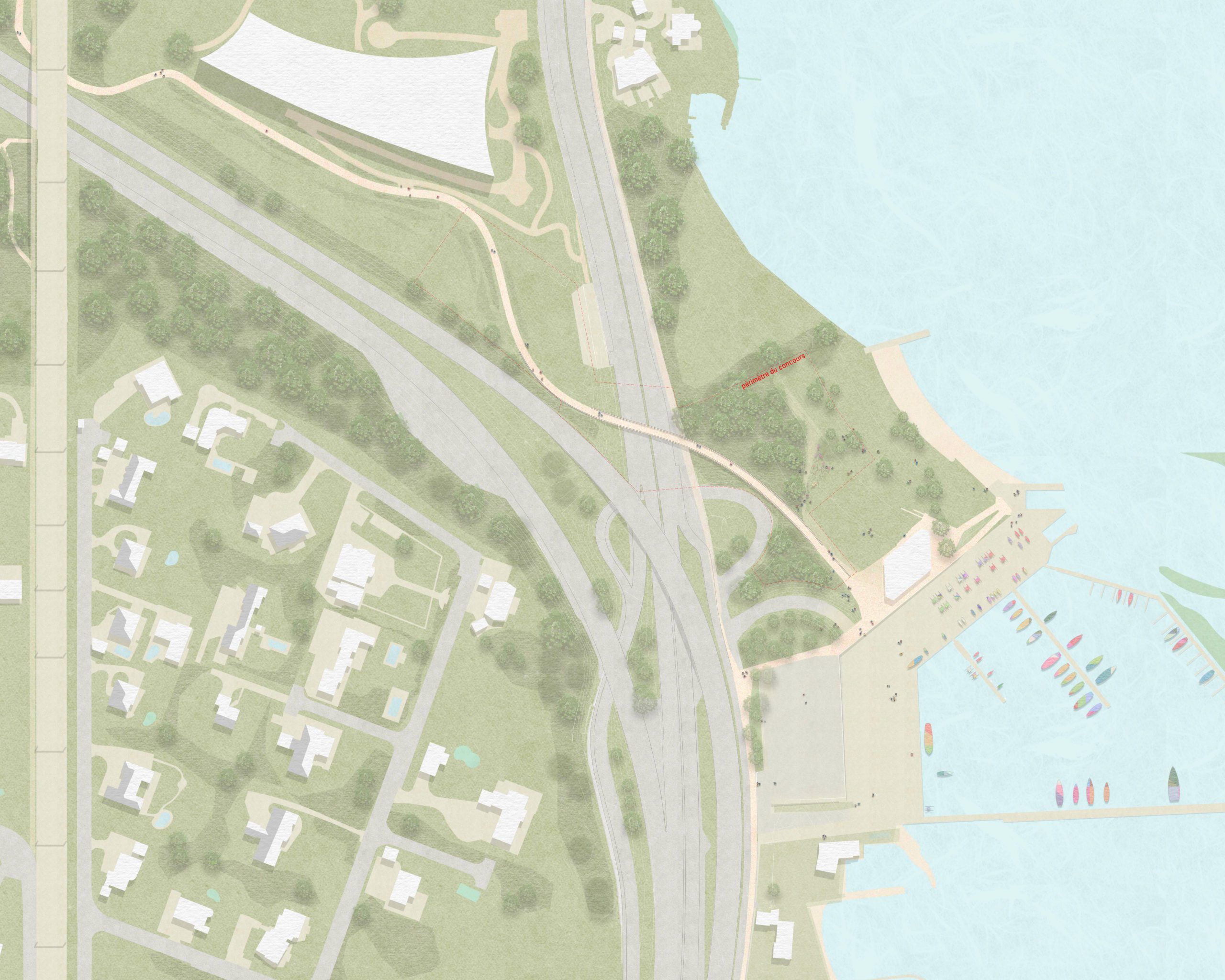 La sinuosité du chemin a été privilégiée pour favoriser la promenade, tout en conservant un tracé suffisamment tendu afin de ne pas s’écarter trop des lignes de désirs des piétons.