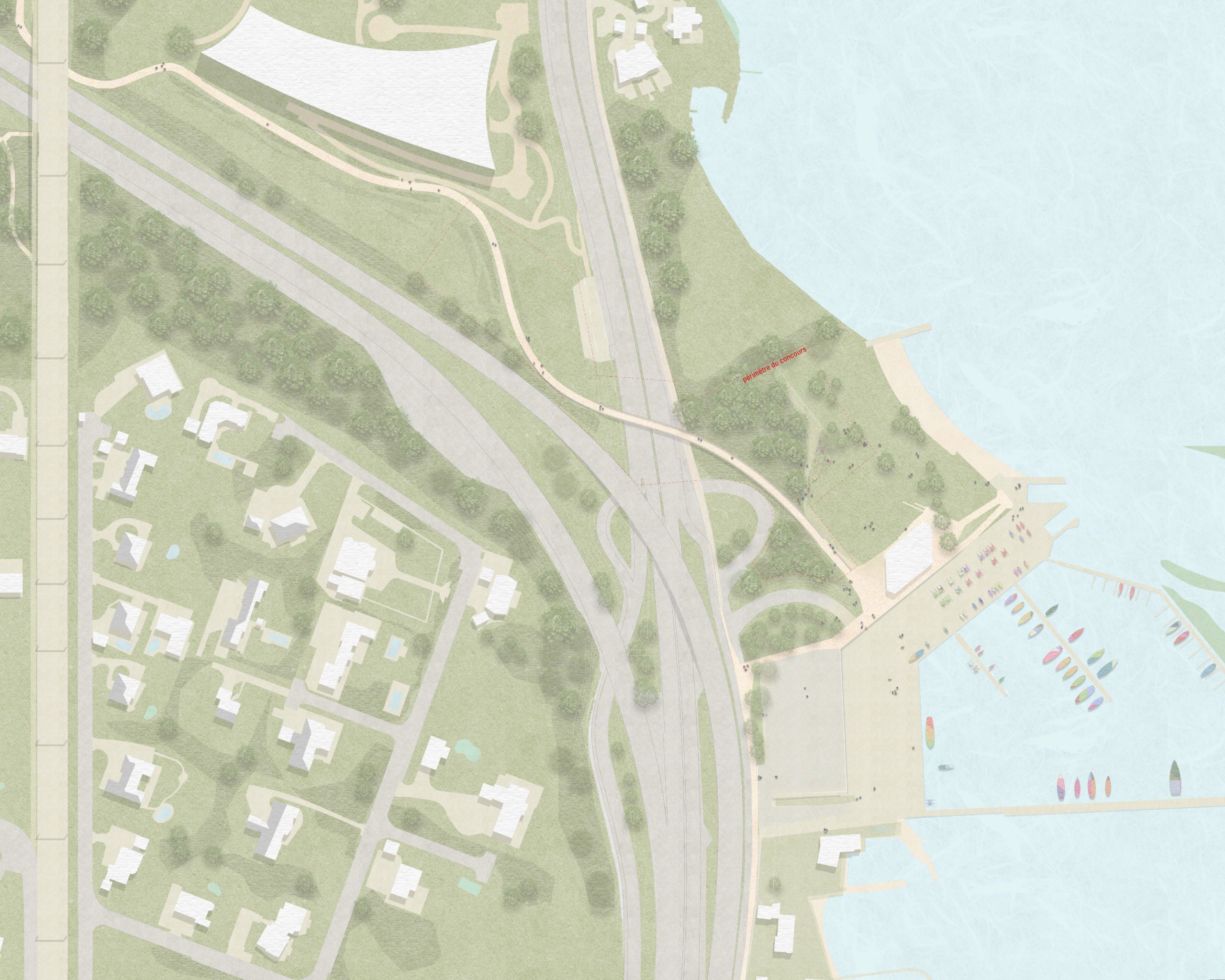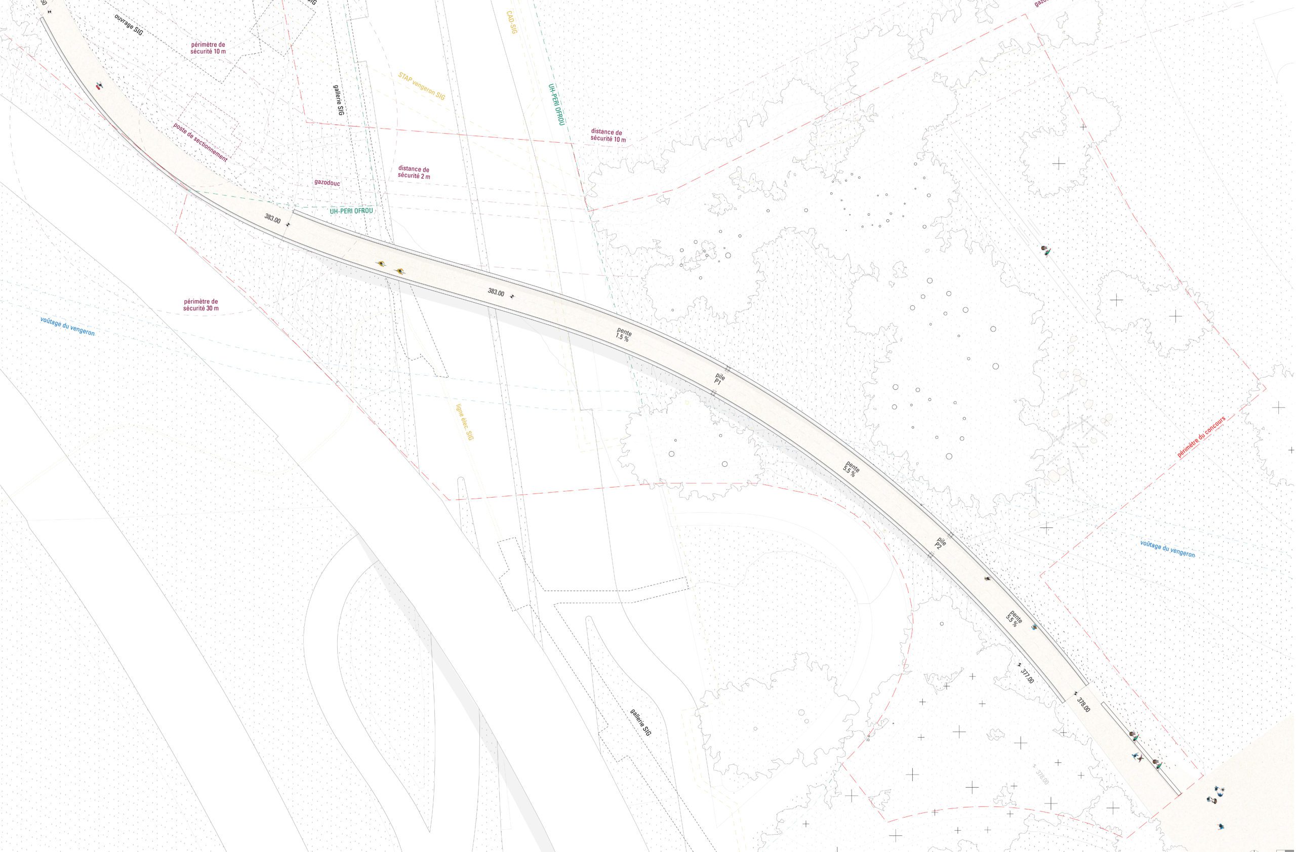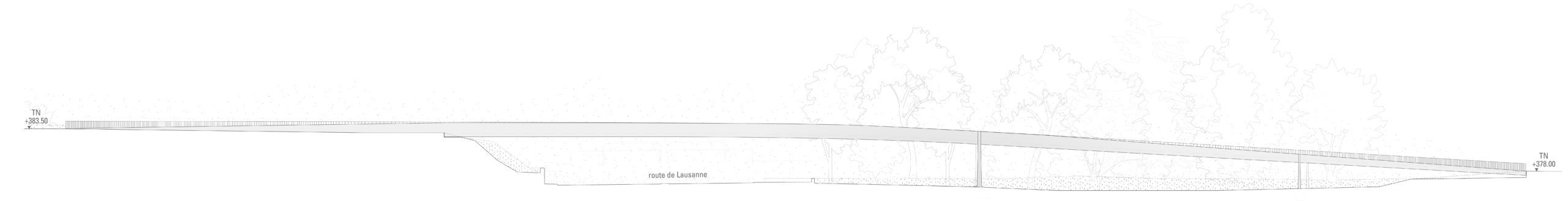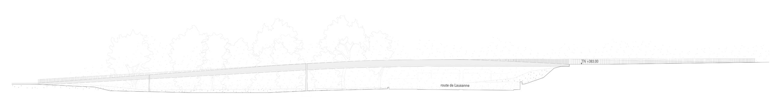 Côté amont, le choix d’un tracé direct arrivant sur le domaine OFROU permet de franchir élégamment la route avec une portée plus réduite, par rapport à l’alternative en diagonale nécessaire pour arriver au domaine communal. Côté aval, le tracé en plan de la passerelle se situe en arrière du périmètre arboré afin de préserver au maximum les racines des arbres et réduire l’incidence des travaux et de l’ouvrage sur la végétation existante, tout en s’éloignant du cordon boisé en limite de parcelle. La passerelle arrive ainsi au départ des cheminements envisagés dans le cadre du réaménagement de la plage du Vengeron et permet à l’arrivée d’offrir un belvédère sur la rade de Genève.