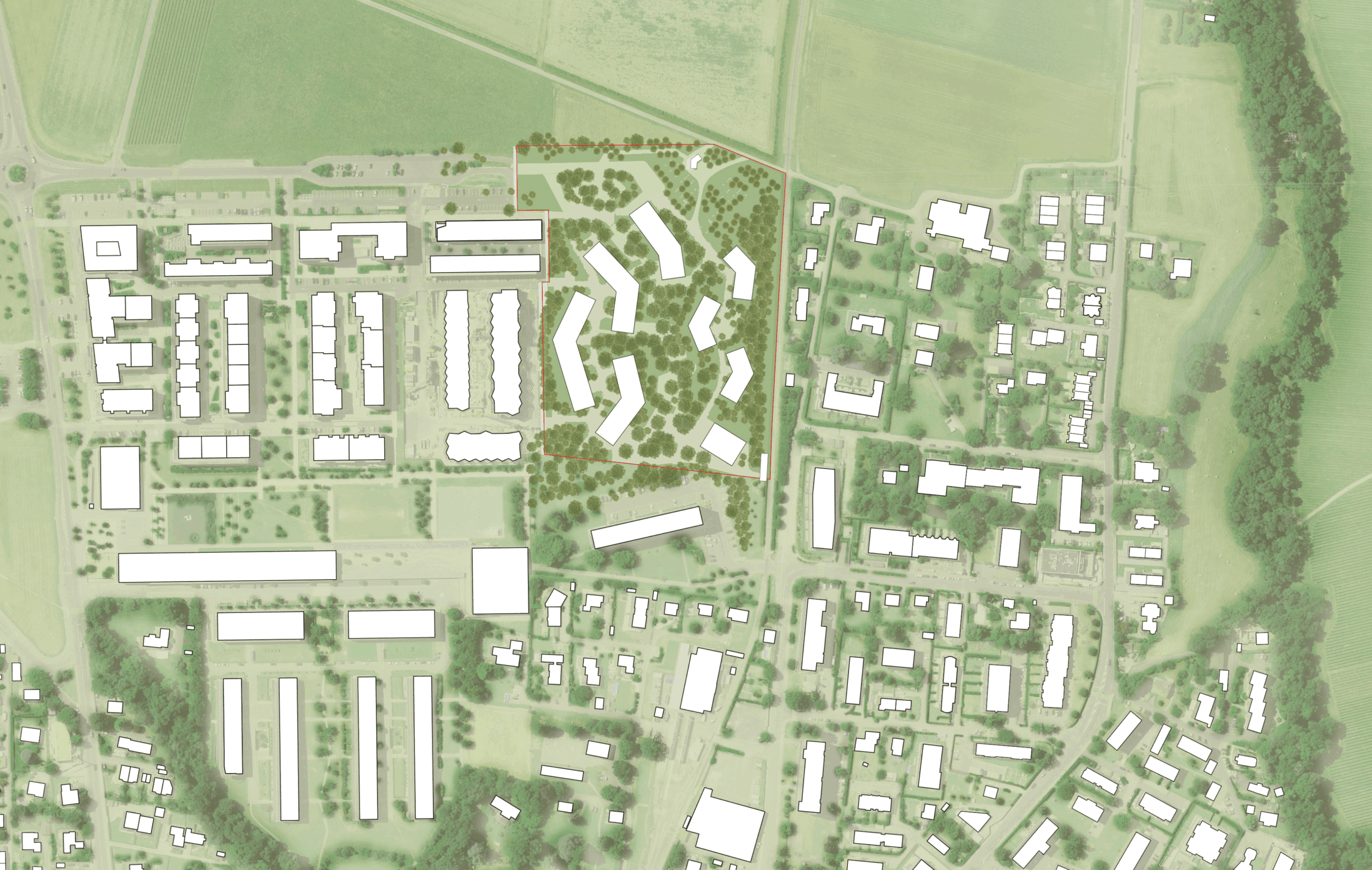 Situé en frange nord de Nyon, en contact direct avec les terres agricoles qui s’étendent jusqu’au pied du Jura, le site occupe une position stratégique en limite d’urbanisation. Le projet y assume un rôle clé : mettre en scène et accompagner la transition entre tissu urbain et paysage rural, tout en tissant un maillage écologique qui relie le Jura au Léman.