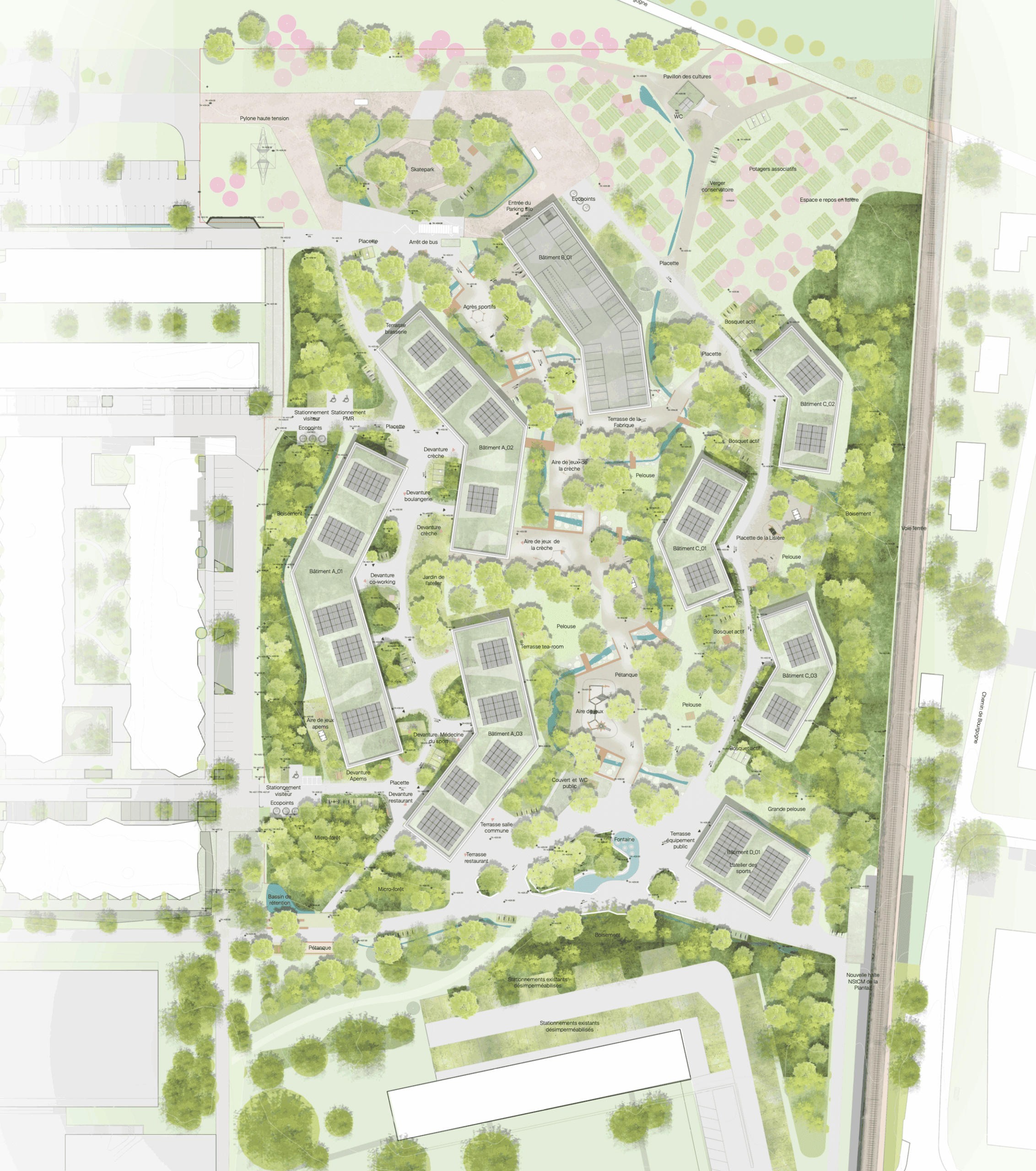 Au sud, une place minérale arborée se déploie autour d’un jeu de gradins en dialogue avec un bassin-fontaine, lieu de rencontre et de fraîcheur. À l’opposé, la partie nord abrite un vaste verger et des potagers partagés pour les habitants, accompagnés d’un pavillon dédié aux cultures, d’un skatepark et d’un parking silo végétalisé intégré dans le tissu bâti. Les franges est et ouest, composées de strates arborées et arbustives, jouent le rôle de lisières écologiques et intègrent la gestion des eaux.