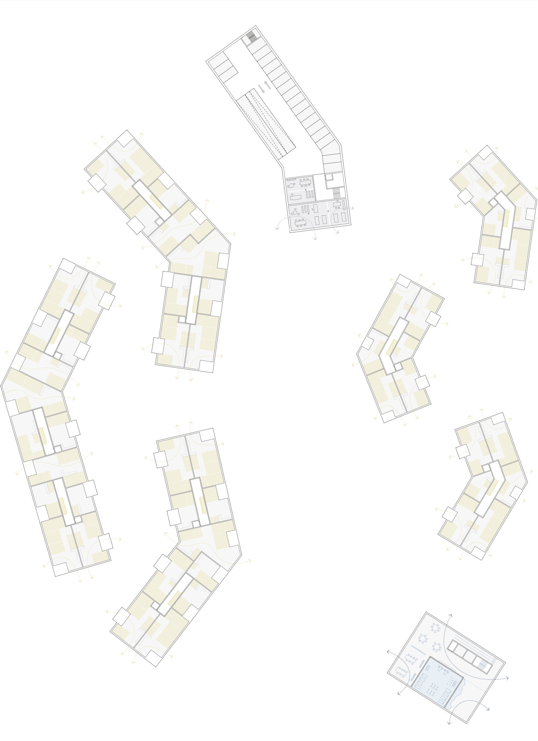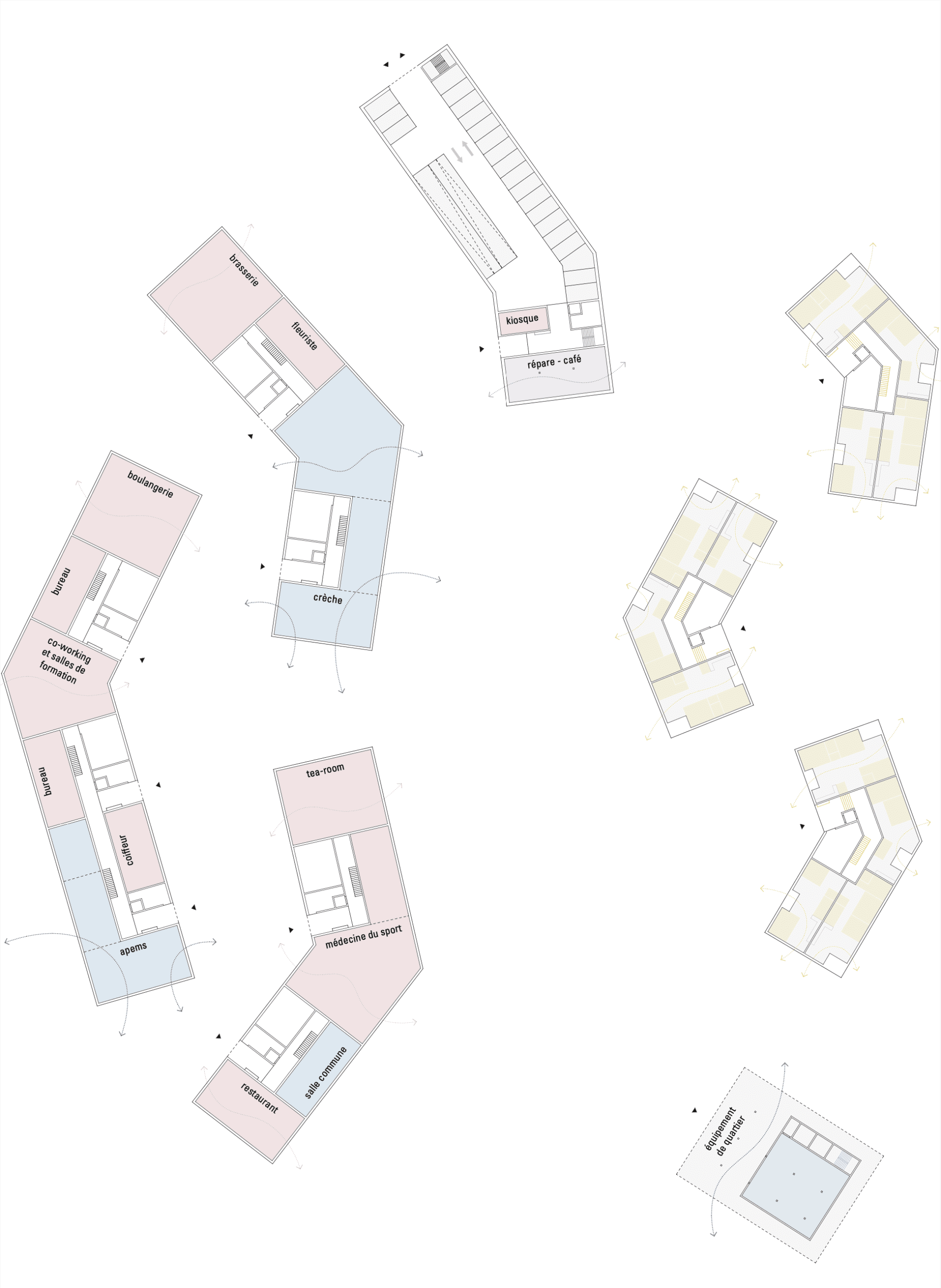 Le parc s’organise comme une succession d’espaces thématiques reliés par un parcours arboré : zones calmes en gazon fleuri, aires de jeux intergénérationnelles et espaces de loisirs s’y imbriquent, permettant à toutes les générations de se croiser. Les rez-de-chaussée actifs s’ouvrent sur des terrasses et placettes, prolongeant la vie urbaine dans l’espace public.