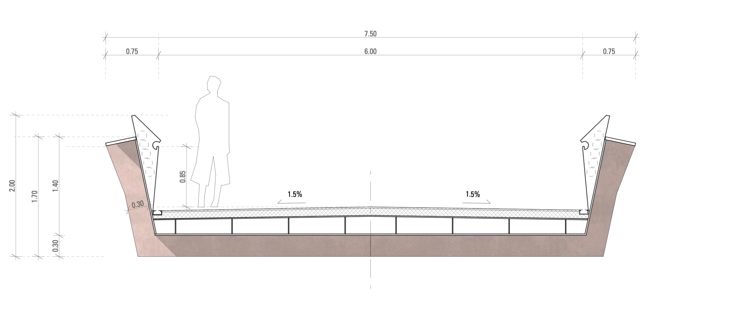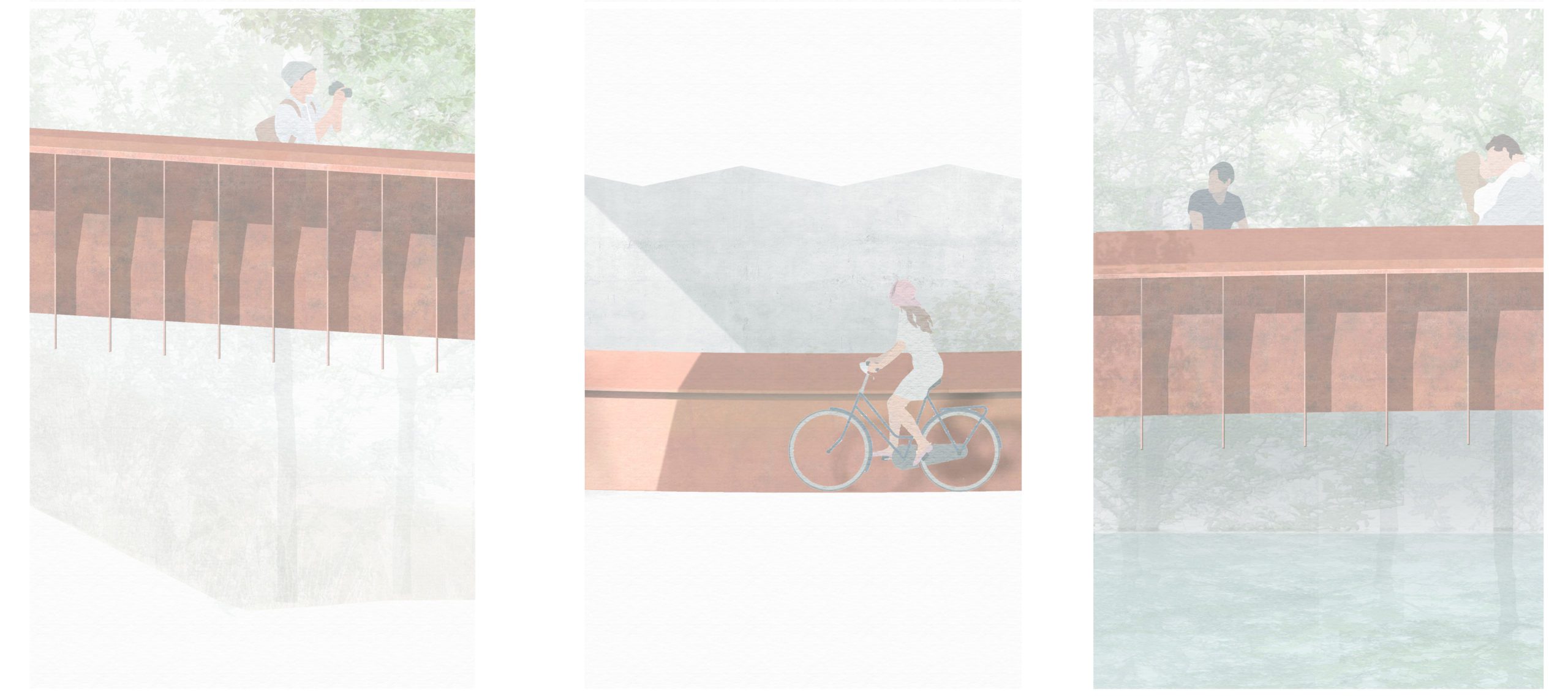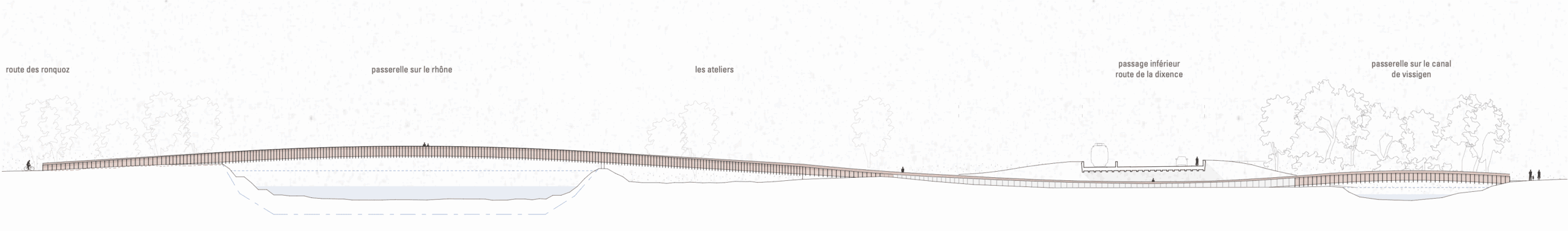Dans un élan simple et continu, une première passerelle prolonge la future Promenade des Pêcheurs, en longeant le Canal de Vissigen. Dans un rythme ondulatoire dansant, la voie douce monte puis descend sous la rue de la Dixence. Elle arrive au niveau du parking de la pizzeria, qui deviendra perméable et végétalisé, au gré des étapes de transformation du site. Le cordon boisé du Rhône est renforcé par une futaie élevée qui immerge, en partie, les usagers de la Grande Passerelle sous une canopée généreuse.